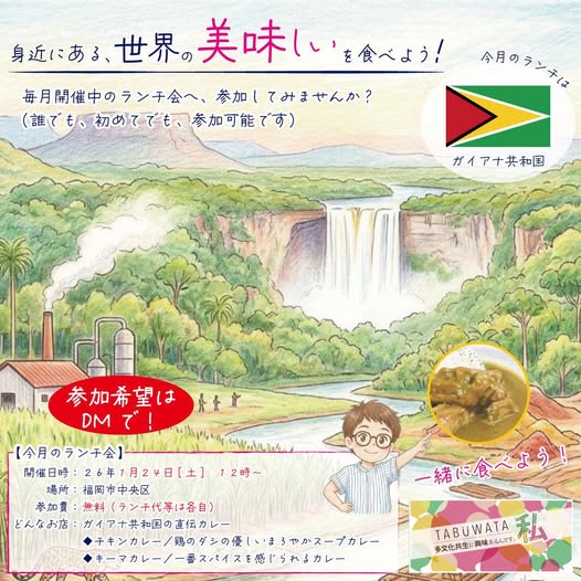 今月のTABUWATAランチ会は、 1月24日(土)12時から。福岡市中央区にある南米ガイアナ共和国の家庭直伝のカレー屋さんへ行きます!