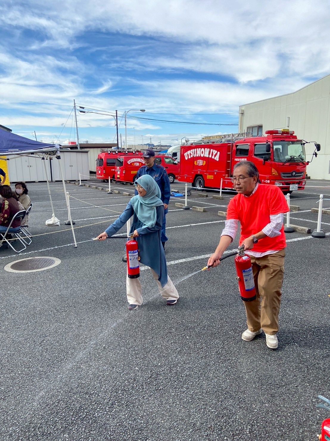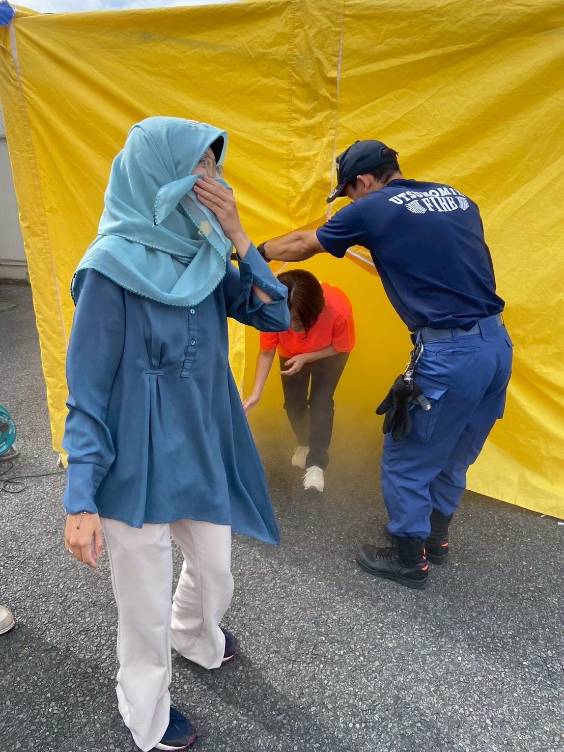 イベント自体には消防署の方がいらっしゃり、煙体験や消化器体系、消防車の見学などができました。参加者は各国の「救急車を呼ぶ電話番号を調べよう」というクイズなどが配られ、みなさん、出展されている人たちに「救急車を呼ぶのは何番?」などと聞いていました。「119だよ」と言われて、「え!日本と同じなんですね」なんて会話もお店の前で繰り広げられていました。