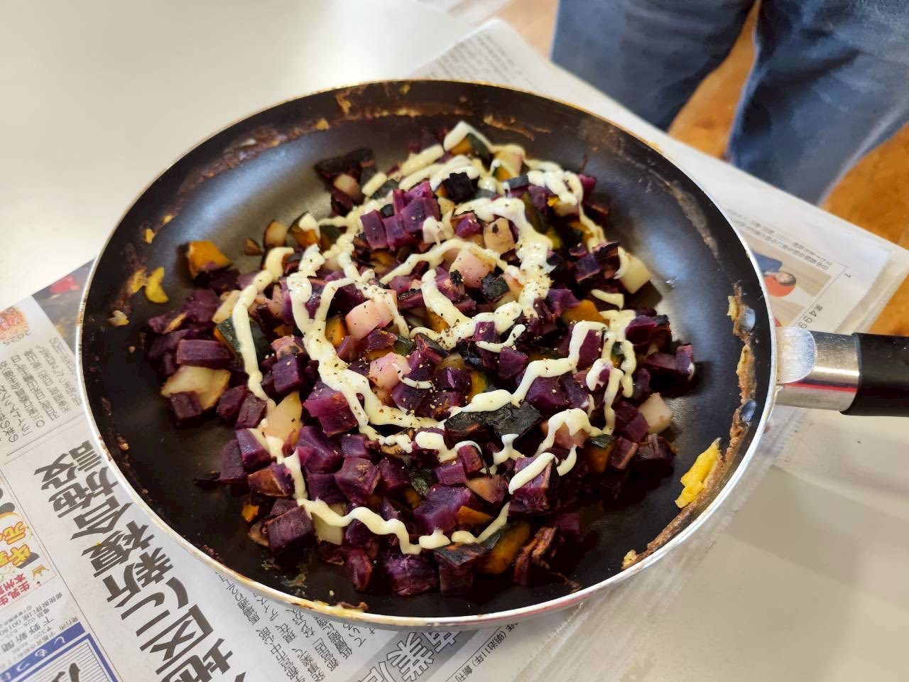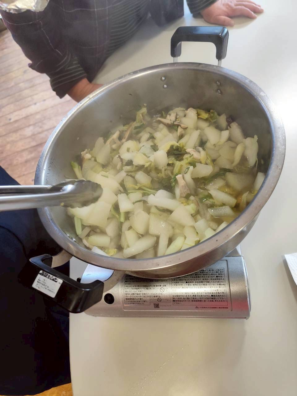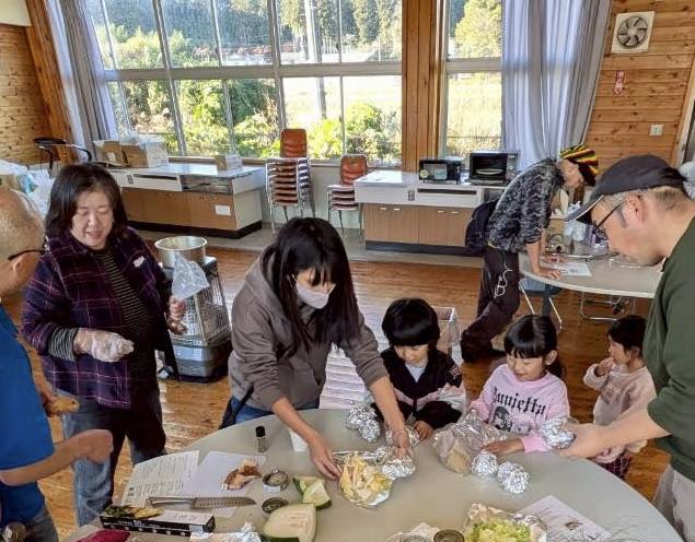 その間、残ったダイコンの葉や、名前のわからない?野菜を余すことなく、刻んで鍋でぐつぐつと炊いてフライパンいっぱいに流し込んだ甘くておいしい卵焼きにするなど、気がつくと、参加者たちの創意工夫で予定になかったいくつもの創作料理が並び、にぎやかな食卓になりました!