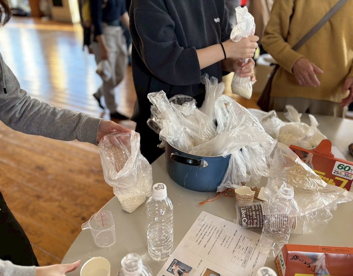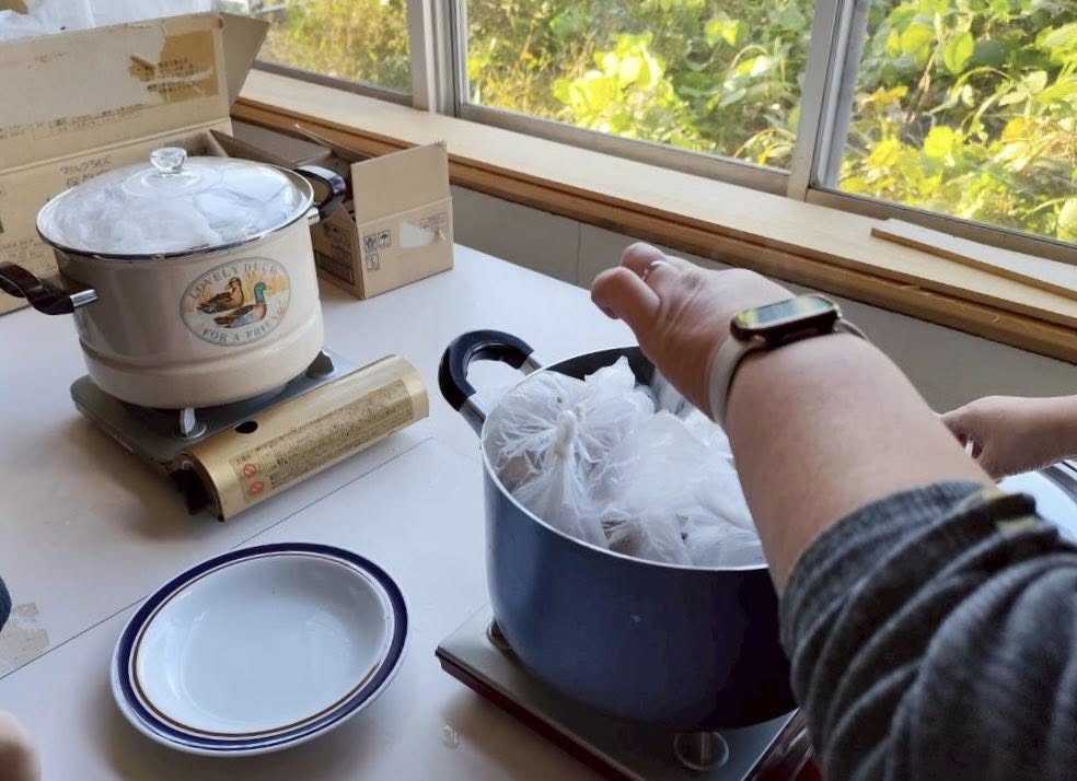 まずは「ポリ袋炊きごはん」。お米をビニール袋に入れて、鍋で炊きます。いや、煮ました。