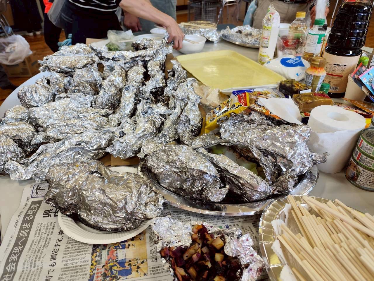 「ホイル焼き」は、大根,白菜、じゃがいも、しいたけなどの野菜と缶詰めの中身をアルミホイルでつつんでバーベキューで焼きます。