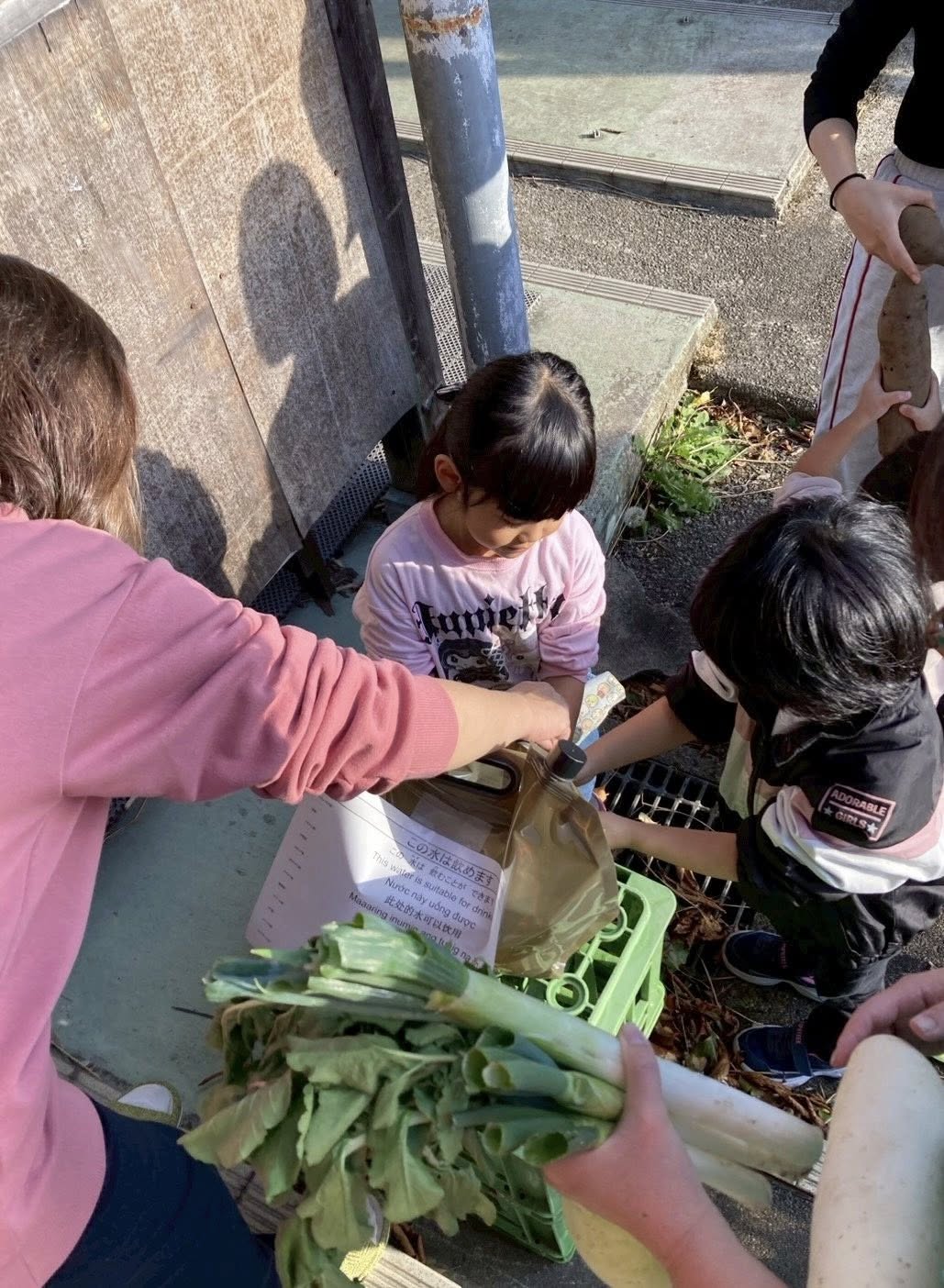 準備では、子どもたちが小さな手でじゃがいも握りしめてて、ポリタンクの水で洗ってくれました。水を大切にしようと服を濡らしながら。